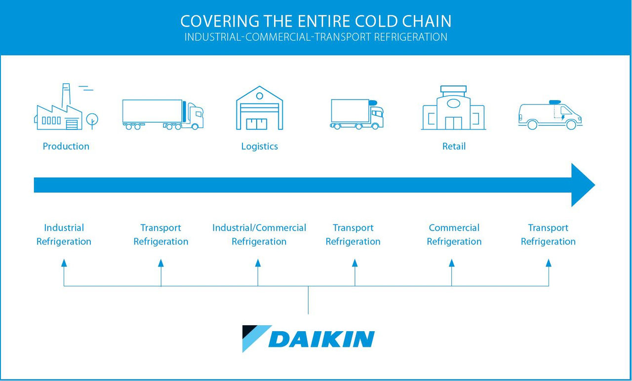 Со комбинирање на стручноста за разладување со иновативна технологија, широкиот асортиман на Daikin овозможува интегрирани решенија за управување со температурата коишто ги подобруваат квалитетот и безбедноста при секоја фаза во процесот на дистрибуција - од почеток на производството до крајната достава.